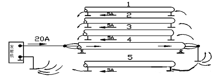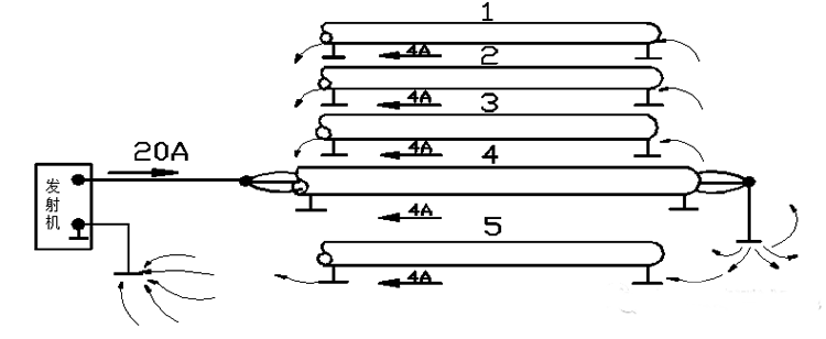 由于電纜屏蔽層通常與地相連,如果電纜束中,其它電纜也接到公共地上,發(fā)生器上黑色輸出插孔可連到公共地上,返回電流在幾根電纜屏蔽層進(jìn)行分配,將返回電流分成許多支流,意味著被識(shí)別電纜的差值電流較大,有用信號(hào)較清楚,“差值”的意思是輸出電流和其分得的返回電流在同一通道內(nèi)。如圖4所示,圖4中有5根電纜,4號(hào)電纜是我們需要識(shí)別的,要識(shí)別的電纜中“輸出電流”為20A。假設(shè)返回電流在所有電纜的屏蔽層中平均分配,在要測(cè)的電纜中應(yīng)有4A的返回電流,要識(shí)別的電纜中的差值為:20A(輸出)-4A(返回)=16A(差值)