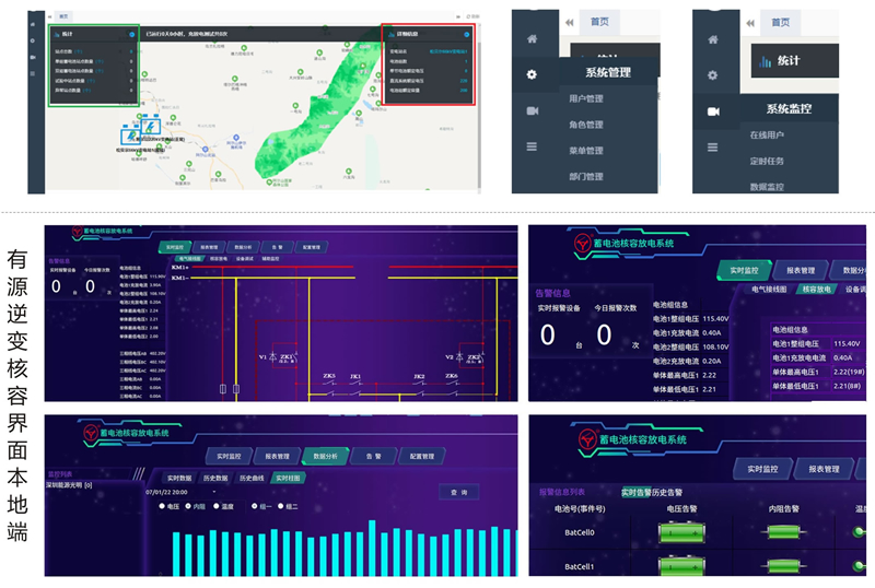 ★ 本地及后臺核容過程可視化:可在本地端和后臺實時監(jiān)視充放電過程,實時顯示各開關(guān)分合狀態(tài)、交直流和蓄電池運行數(shù)據(jù)等,進行本地及遠程的充放電控制。